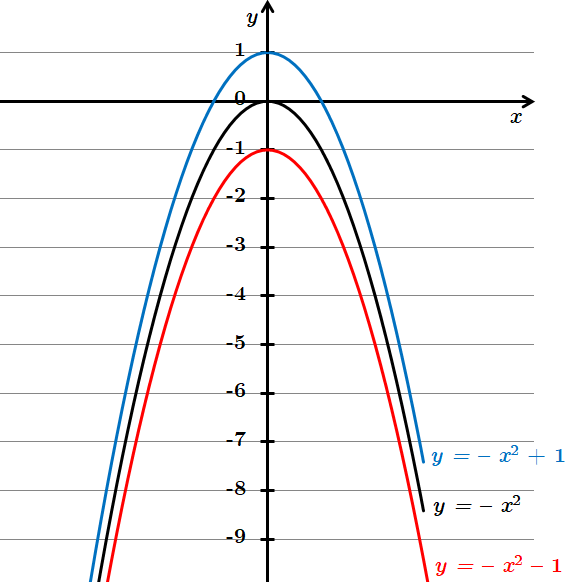 \(y=-x^2+1\) отримаємо, якщо \(y=x^2\) відобразимо симетрично відносно осі \(Ox\) та перенесенням на \(1\) одиницю вгору вздовж осі \(Oy.\)