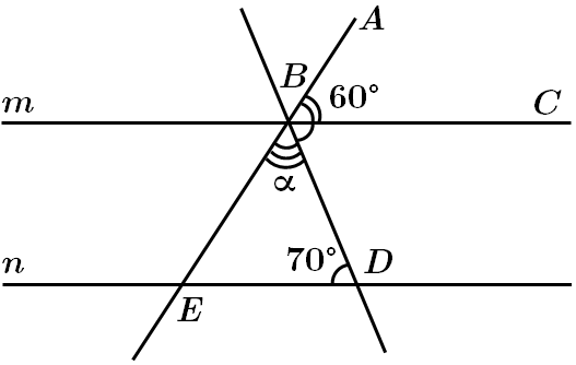 \(\angle ABC+\angle CBD+\angle DBE=180^\circ\), \(\angle CBD=\angle BDE=70^\circ\), як внутрішні різносторонні при \(m\ ||\ n\) та січною \(BD.\) Кут \(\style{font-style:normal;font-weight:bold;font-size:1.1em}{\alpha}=180^\circ-60^\circ-70^\circ=50^\circ.\)
