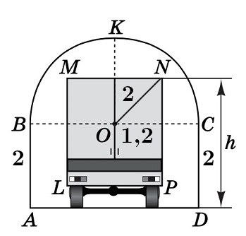 $$ h=CD+NE=2+1\mathord{,}6=3\mathord{,}6\ \textit{м}. $$При значенні \(3\mathord{,}6\) м вантажівка дотикається арки, тому максимально можливе значення – \(3\mathord{,}5\) м.