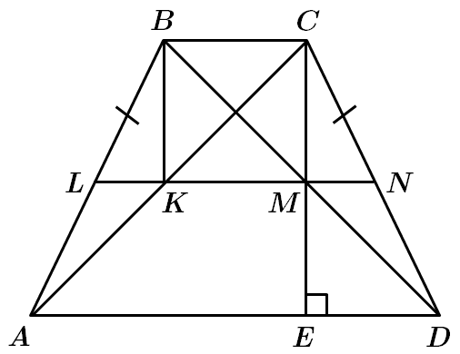 \(KM\) з'єднує середини діагоналей \(AC\) та \(BD\), належить середній лінії \(LN.\)