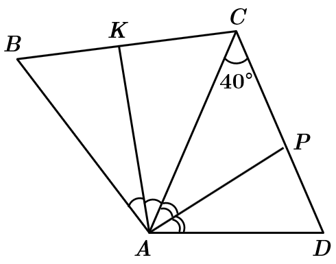 4. \(\angle BAD=130^\circ.\) \(AK\) – бісектриса \(\angle BAC\), \(AP\) – бісектриса \(\angle CAD.\)