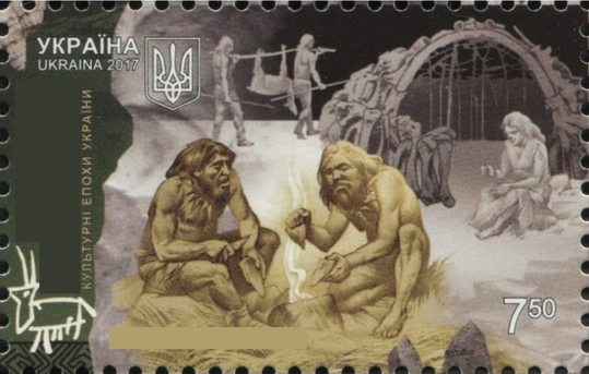 У період палеоліту людина використовувала кам’яні знаряддя праці, навчилася добувати вогонь, а також будувала житла з бивнів мамонта, що ми й бачимо на зображеній марці.