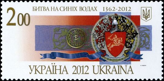 Марку присвячено 650-річчю битви, що відбулася на річці Сині Води (Поділля) між литовсько-руським військом Великого князя Литовського Ольгерда Гедиміновича й ордами монголо-татарських правителів.