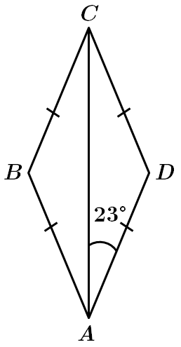 Або можна обчислити більший кут ромба іншим способом. За властивістю ромба, \(AC\) – бісектриса кута \(A{:}\) $$ \angle BAD=2\cdot 23^\circ=46^\circ. $$