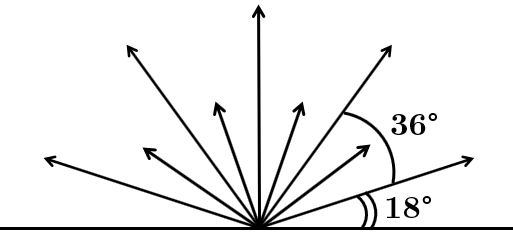 Розгорнутий кут поділено на \(10\) рівних частин. Градусна міра кожного з-поміж цих кутів $$ 180^\circ: 10=18^\circ. $$