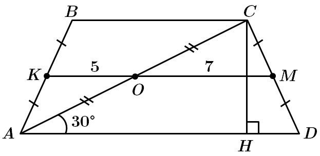 \begin{gather*} OM=\frac 12AD,\\[6pt] AD=14\ \text{см}. \end{gather*}Побудуймо \(CH\ \perp\ AD.\)