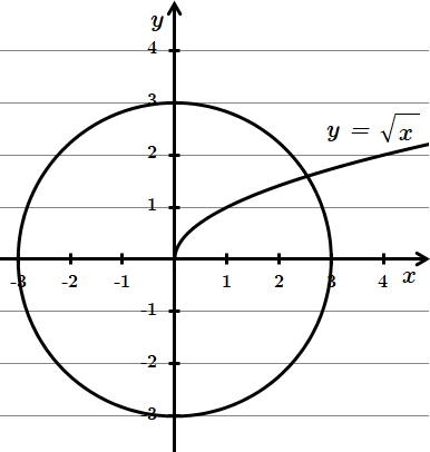 2. \(y=\sqrt{x}\) має лише одну спільну точку з колом \(x^2+y^2=9\) (центра кола \((0; 0)\) і радіус \(3\)).