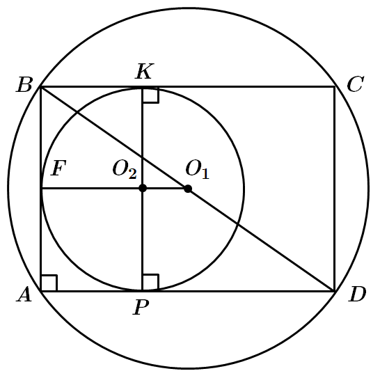 2. Центр кола \(O_1\), описаного навколо прямокутника \(ABCD\), лежить на середині діагоналі \(BD.\)