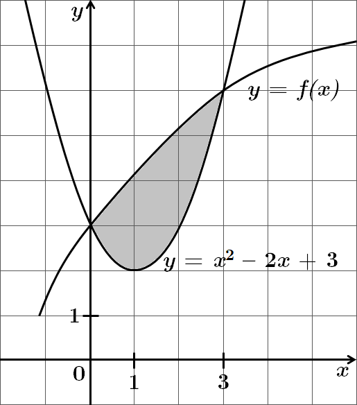 Площу зафарбованої фігури можна обчислити за допомогою визначеного інтеграла: $$ S=\mathop{\int}\limits_a^b \left(f(x)-g(x)\right) dx, $$ де \(f(x)\) – це функція, графік якої обмежує фігуру згори, а \(g(x)\) – функція, графік якої обмежує фігуру знизу.