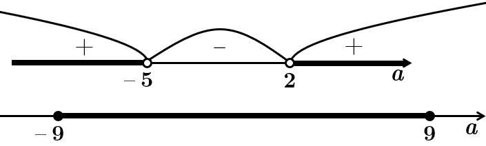 На проміжку \(a\in [-9; 9]\) рівняння має розв'язок, якщо \(a\in [-9; -5)\cup (2; 9].\)
