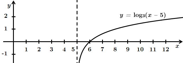 2. \(y=\log_3(x-5)\) – логарифмічна функція. Графік функції \(y=\log_3x\) перенесено паралельно вздовж осі \(Ox\) на \(5\) одиниць управо.