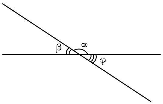 Кути \(\style{font-style:normal;font-weight:bold;font-size:1.1em}{\alpha}\) i \(\style{font-style:normal;font-weight:bold;font-size:1.1em}{\beta}\) – суміжні. За властивістю суміжних кутів: