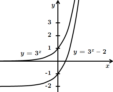 Запис \(y=3^x \rightarrow y=3^x-2\) означає, що графік функції перемістили вниз на \(2\) одиниці, бо \(A=-2.\)