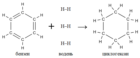 \begin{gather*} \mathrm{\underset{\text{бензен}}{C_6H_6}+\underset{\text{водень}}{3H_2}\rightarrow \underset{\text{циклогексан}}{C_6H_{12}}} \end{gather*}Тримеризація етину – один зі способів добування бензену: \begin{gather*} \mathrm{\underset{\text{етин}}{3C_2H_2}\rightarrow \underset{\text{бензен}}{C_6H_6}} \end{gather*}