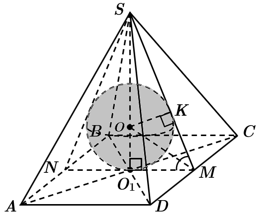 Це завдання перевіряє вміння розв’язувати задачі на комбінації геометричних тіл, зокрема обчислювати об’єм правильної чотирикутної піраміди за відомими радіусом вписаної кулі та кутом нахилу бічної грані до площини основи піраміди.