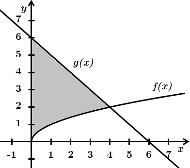 4. Обчислимо площу фігури, обмеженої графіками функцій \(f\) і \(g\) та віссю \(y.\)