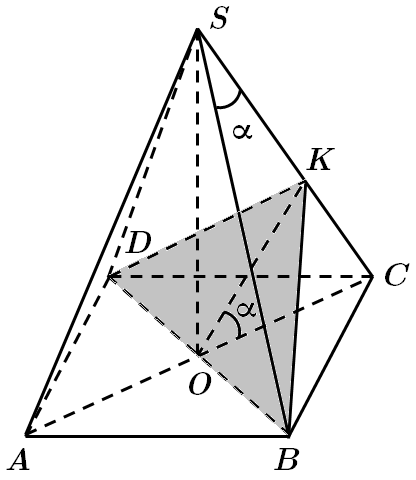 У \(\Delta SOK\ (\angle K=90^\circ)\ \angle S=\style{font-style:normal;font-weight:bold;font-size:1.1em}{\alpha}\), \(SO=H.\)