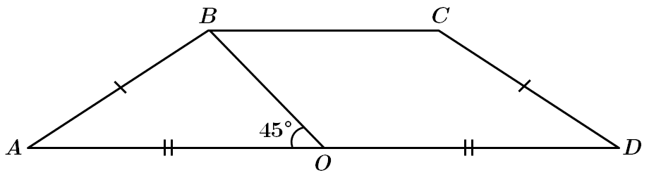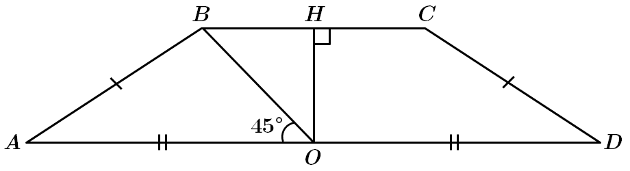 \begin{gather*} AD:BC=5:2,\\[6pt] BC=\frac{2AD}{5}=\frac{2b}{5},\\[6pt] BH=\frac 12BC=\frac b5. \end{gather*}3. \(\angle AOB=45^\circ\), \(\angle AOH=90^\circ.\) Отже, \(\angle BOH=45^\circ\) а \(\Delta BHO\) – прямокутний рівнобедрений. \(BH=HO=\frac b5.\)