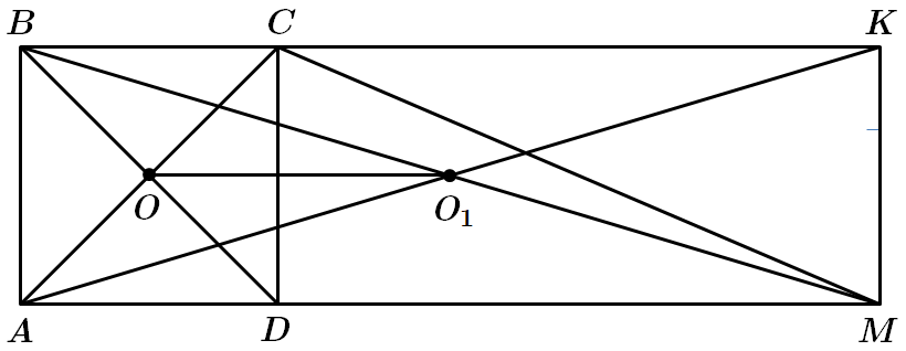 3. Відстань між точкою \(O\) – центр квадрата, \(O_1\) – точка перетину діагоналей прямокутника \(ABKM\) – відрізок \(OO_1.\) \(BO_1=O_1M.\)