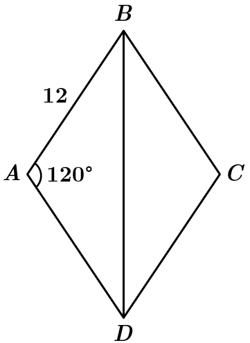\begin{gather*} BD^2=AB^2+AD^2-2\cdot AB\cdot AD\cdot \cos A=\\[6pt] =12^2+12^2-2\cdot 12\cdot 12\cdot \left(-\frac 12\right)=\\[6pt] =2\cdot 12^2+12^2=3\cdot 12^2. \end{gather*}