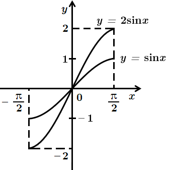 На рисунку зображено перетворення графіка функції \(y=\sin x\rightarrow y=2\sin x.\)