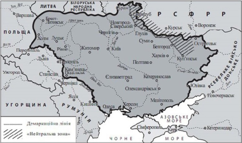 Також на картосхемі відображено умови премілітарного (попереднього) мирного договору між Українською Державою та більшовицькою РСФРС: лінію розмежування військ (демаркаційну лінію) і нейтральну зону, де було заборонено перебувати будь-яким військам.