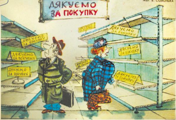 На прилавках крамниці немає жодного товару, оскільки населення скуповувало усе, щоб врятувати свої заощадження під час гіперінфляції (знецінення грошей). На початку 90-х років XX ст. ціни в Україні зростали катастрофічними темпами, що супроводжувалося критичним зниженням рівня життя населення.