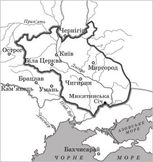 На картосхемі окреслено територію Війська Запорозького (Гетьманщини) відповідно до умов Білоцерківської мирної угоди, укладеної 1651 р. Їй передувала трагічна битва під Берестечком.