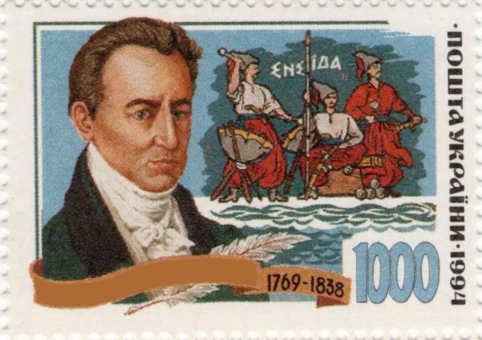 Ілюстративне поле марки містить номінал і рік її випуску, написи Енеїда, 1769–1838, а також стилізоване зображення героїв твору – козаків у човні.