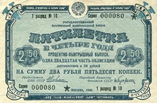 На фото зображено облігацію «П’ятирічку за чотири роки» державної внутрішньої позики Радянського Союзу, випущеної для фінансування форсованої індустріалізації.