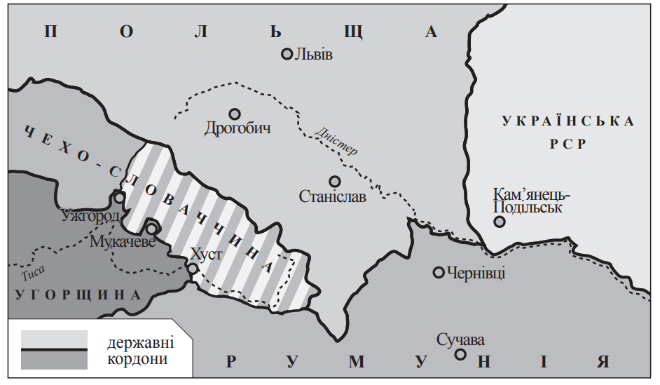 На картосхемі штрихуванням позначено територію Карпатської України. Проголошення її незалежності було зумовлено ліквідацією Чехословаччини, у складі якої перебувало Закарпаття з 1919 р.