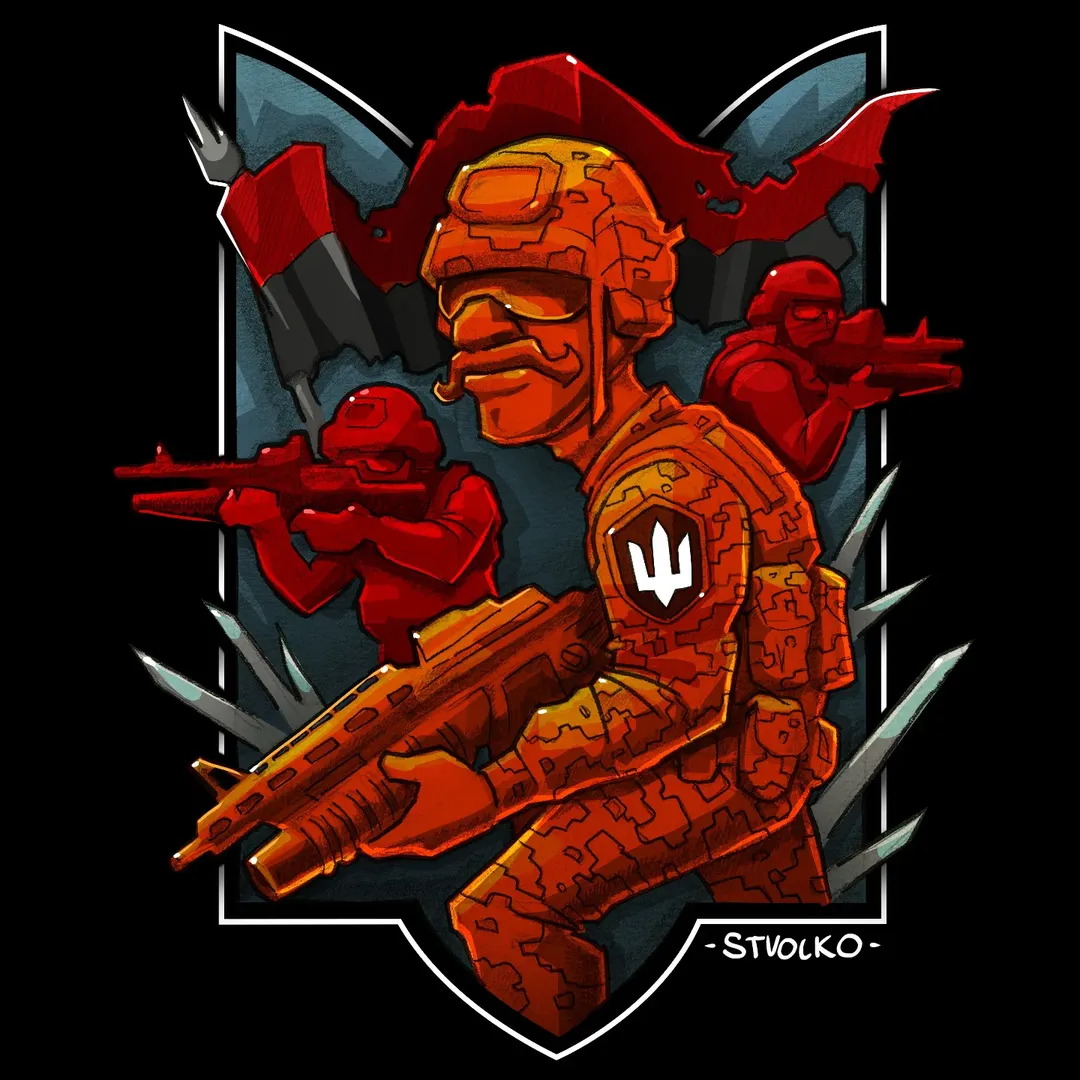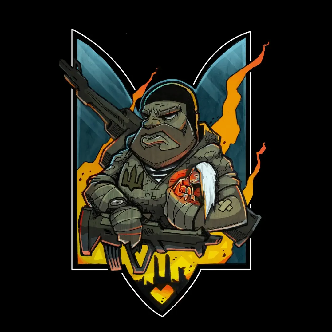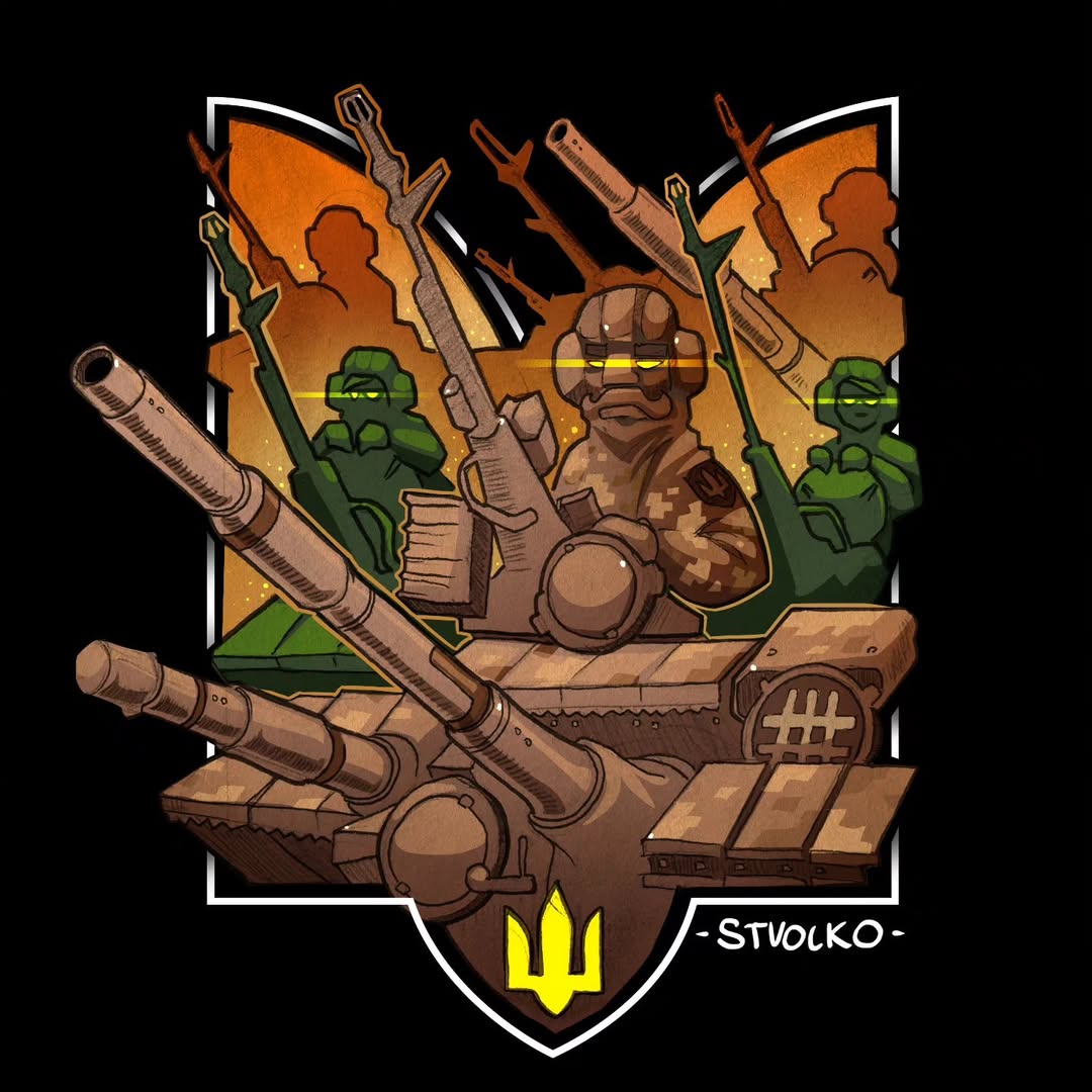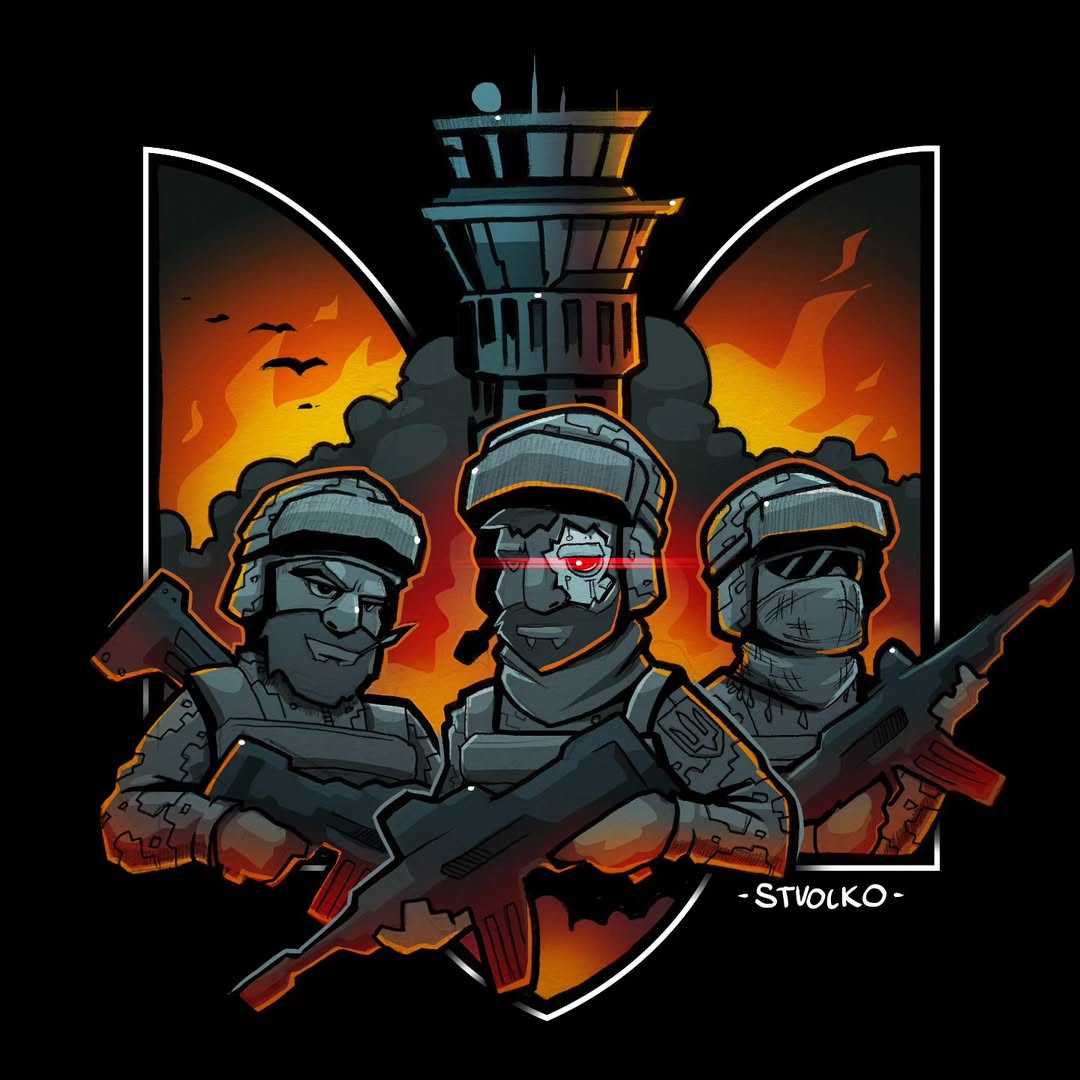 На малюнку зображено захисників Донецького аеропорту «кіборгів» на тлі зруйнованої диспетчерської вежі, яка стала символом стійкості оборони летовища.