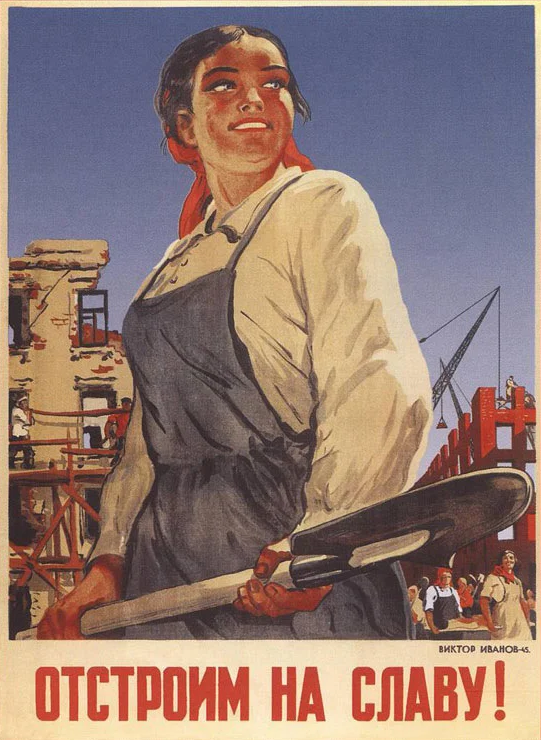 - Гасло плаката «Відбудуймо на славу!» закликає підіймати з руїн народне господарство в перші повоєнні роки (1945–1953 рр.). (А)