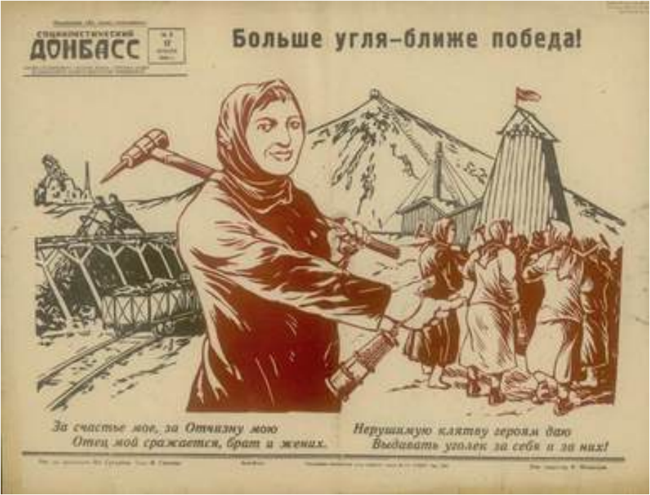 - Плакат «Більше вугілля – ближче перемога!» створено в роки Другої світової війни для трудової мобілізації робітників вугільної промисловості, яка мала стратегічне значення для забезпечення фронту, роботи заводів та залізничного транспорту. (В)
