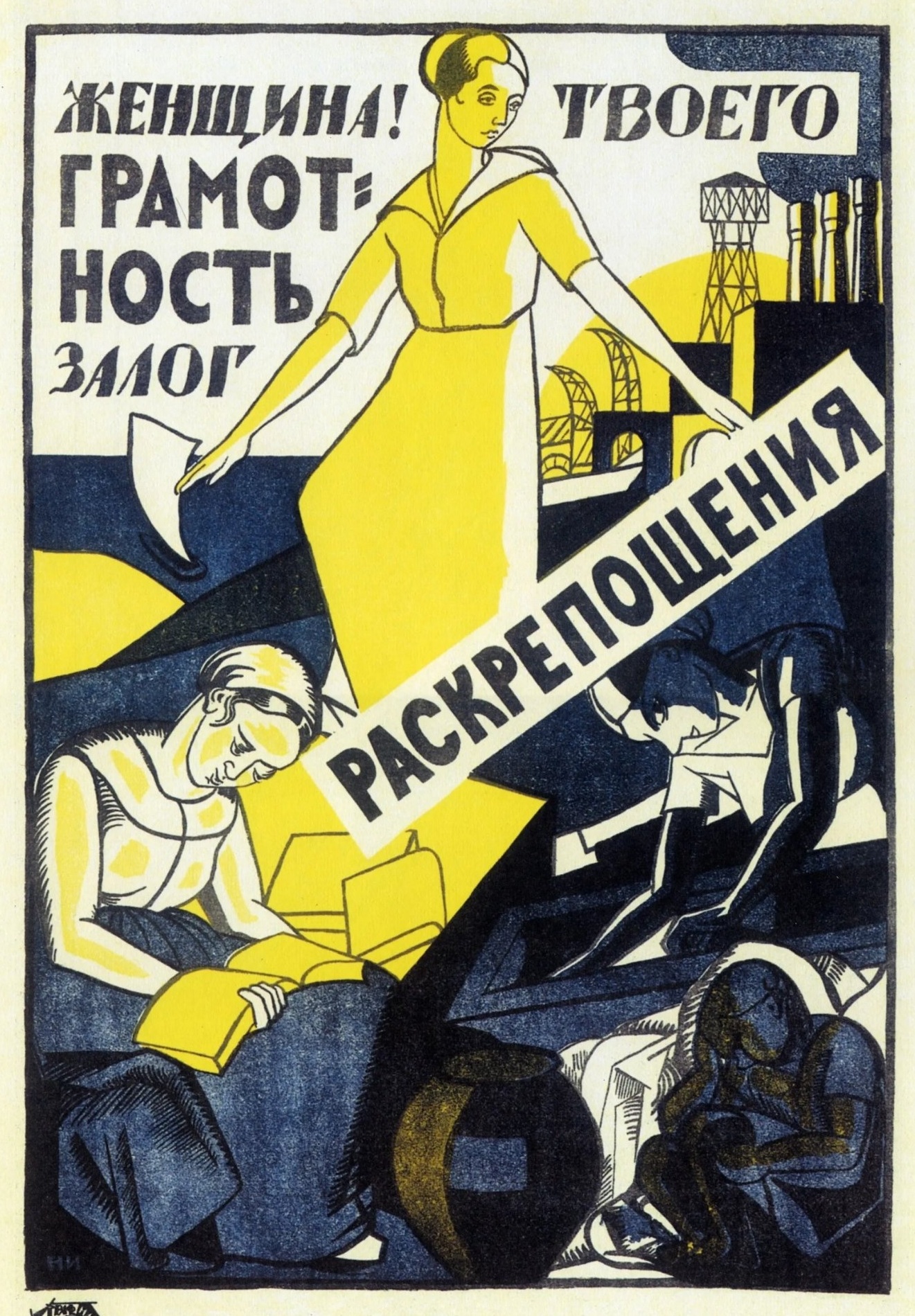 - Агітаційний плакат «Жінко! Грамотність – запорука твого розкріпачення!» був частиною кампанії з ліквідації неписьменності – «лікнепу» – та залучення жінок до громадсько-політичного життя в період нової економічної політики (1921–1928 рр.). (Б)