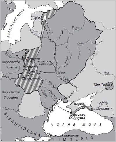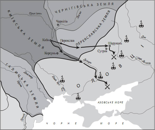Стрілками на картосхемі позначено напрямки походів цих князів, зокрема, походу Володимира на Корсунь 988 р. і Ярослава – на Візантію 1043 р.