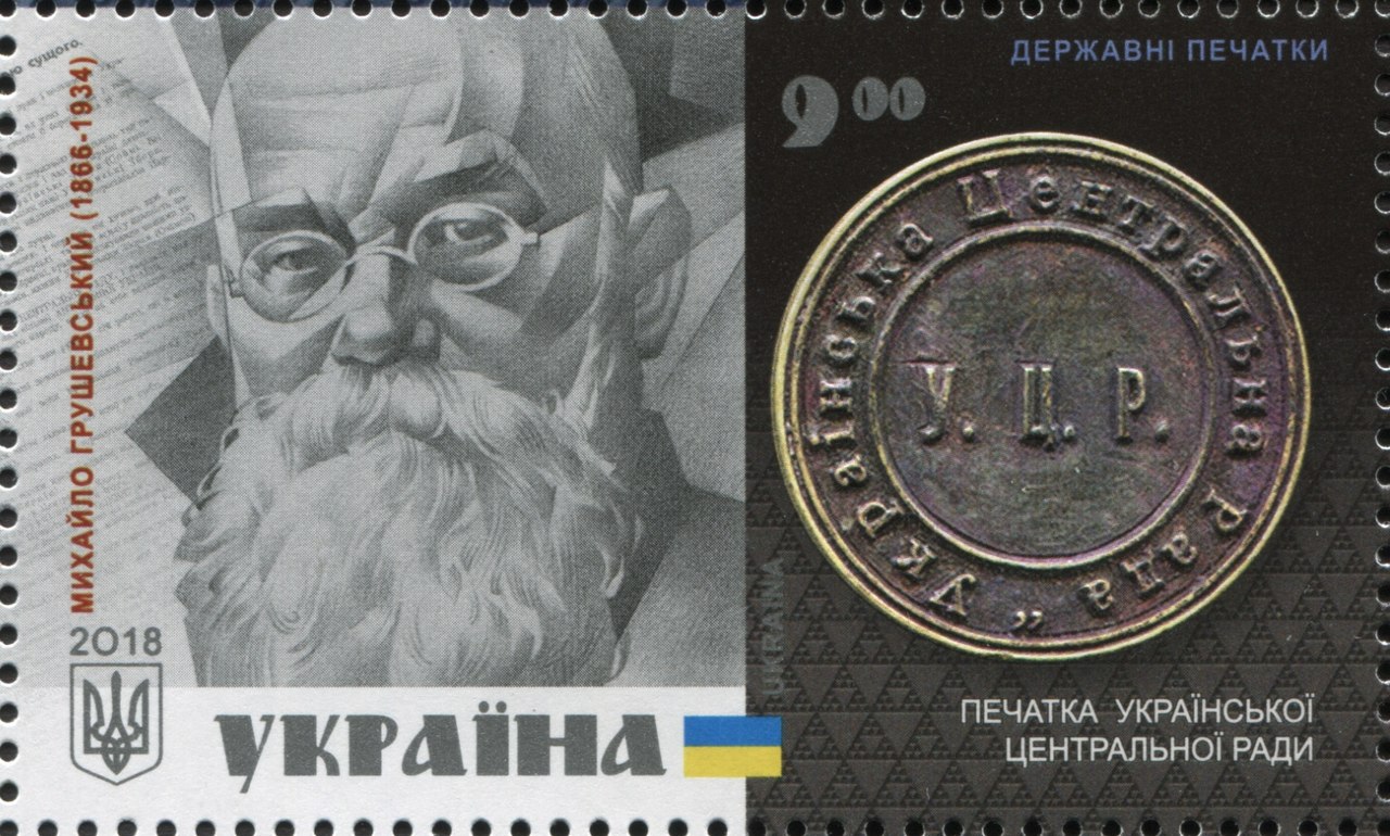 А Дизайн марки «Печатка Української Центральної Ради» включає відтиск офіційної печатки УЦР, заснованої 1917 р., і портрет Голови УЦР Михайла Грушевського.