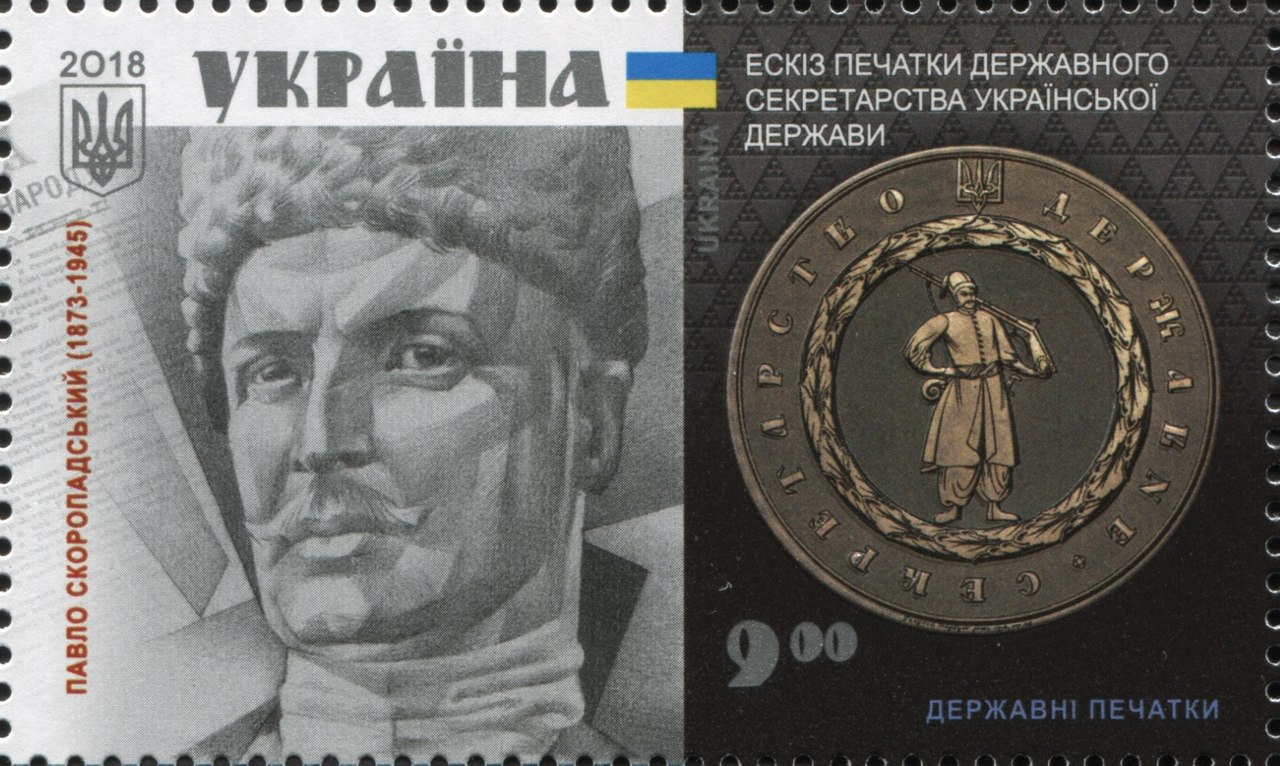 В На марці «Ескіз печатки Державного Секретарства Української Держави» праворуч відтворено ескіз печатки із зображенням козака з мушкетом (герб Війська Запорозького), яке було частиною державного герба Української Держави (квітень – грудень 1918 р.). Ліворуч розміщено портрет гетьмана Павла Скоропадського.