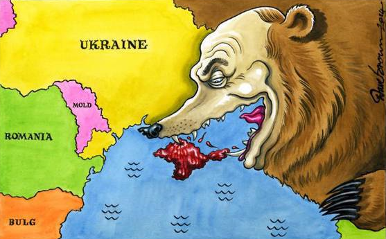 1 – карикатура, на якій російський ведмідь пожирає Кримський півострів, що символізує анексію Криму Російською Федерацією 2014 р.;