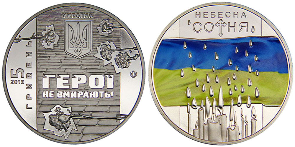 3 – монета «Небесна сотня. Герої не вмирають!», яку створено для вшанування памʼяті загиблих учасників Революції Гідності (грудень 2013 – лютий 2014);