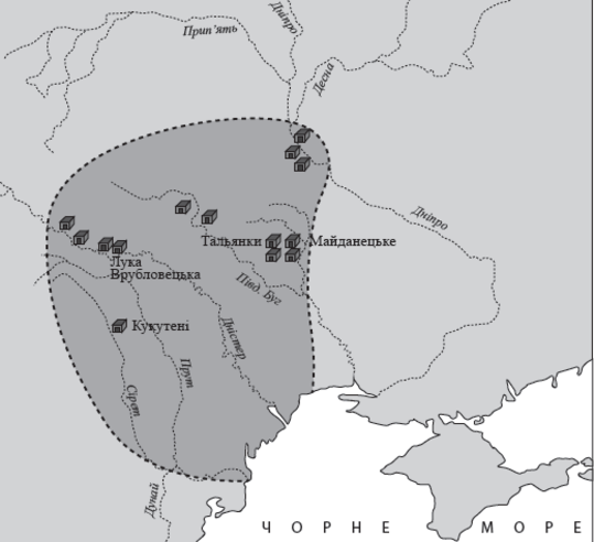 На картосхемі позначено місце проживання племен трипільської археологічної культури, пам’ятки якої відкрито на території Молдови, Румунії та лісостепової зони України – від Прикарпаття на заході до долини Дніпра на сході.