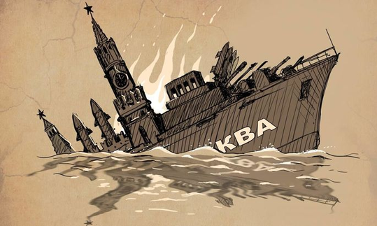 4. Ілюстрація Юрія Журавля з нагоди потоплення Військово-морськими силами України крейсера «Москва» – флагмана Чорноморського флоту Росії. Корабель пішов на дно після того, як 13 квітня 2022 р. українські військові поцілили в нього ракетами «Нептун». Після повномасштабного вторгнення в Україну, яке розпочав Володимир Путін, знищення «Москви» стало символічним ударом по Кремлю й поклало край домінуванню російського флоту в Чорному морі – варіант відповіді Б.
