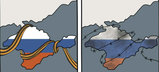 2. Карикатура на анексію Криму – протиправне й невизнане міжнародним співтовариством приєднання Автономної Республіки Крим і Севастополя до складу РФ. Давно сплановану Кремлем спецоперацію з окупації Кримського півострова розпочато 20 лютого 2014 р. на тлі трагічних подій у центрі Києва. А 16 березня на території Криму і Севастополя відбувся псевдореферендум про відновлення конституції Криму 1992 р. і про «входження» Криму до складу Росії, а 18 березня президент Володимир Путін підписав закон про прийняття Криму і Севастополя до складу РФ – варіант відповіді В.