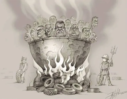 1. Художник Юрій Журавель гротескно зобразив Віктора Януковича та його соратників, яких підсмажуть у казані, а чорти підкидають у вогонь шини, що стали символом протестів часів Революції Гідності. Пекло символізує покарання за злочинні дії влади, яка спробувала придушити Євромайдан. Після його силового розгону 30 листопада 2013 р. протести стали радикальнішими: зʼявилися барикади, полетіли коктейлі Молотова, запалали шини. Під час протистояння із силовиками загинуло 107 учасників – Героїв України, названих Небесною Сотнею – варіант відповіді Г.